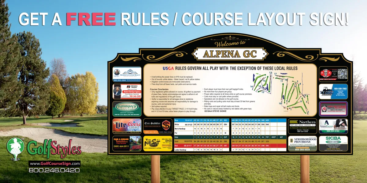 We provide wayfinding, directional, informational and tee signs made of a 1/4" durable, weather resistant double-sided aluminum material sandwiched around a hard plastic middle core and custom professional printed scorecards tailored to your course’s needs. No minimum requirements, if you want to give us a try and only want 1 free sign, that's fine with us. Let us know.